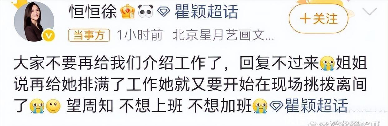 然而,别的明星直播求工作,瞿颖姐是不想工作,实在太好笑了!3月16日,瞿颖经纪人幽默回应翻红,称邀约太多回复不过来,还打趣瞿颖放话:工作排太满就要在现场“挑拨离间”,直言姐姐不想上班、不想加班。